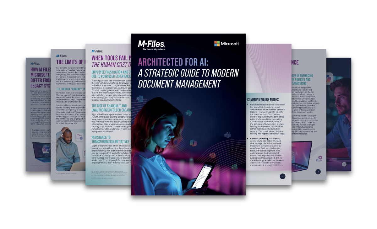 Erfahren Sie, wie M-Files Microsoft gemeinsam Ihr Dokumentenmanagement von einer Quelle der Frustration in einen Wettbewerbsvorteil verwandeln können. Starten Sie noch heute Ihre kostenlose Testversion und erleben Sie selbst, wie Sie Compliance optimieren, Risiken reduzieren und die Zusammenarbeit verbessern können.