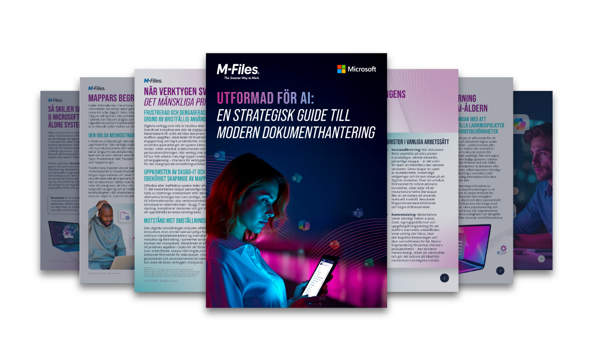 Organisationer är beroende av Microsoft för samarbete och kommunikation, men spridda innehåll, manuella processer och frånkopplade system fortsätter att bromsa arbetet och öka risken för bristande efterlevnad. Architected for AI: A Strategic Guide to Modern Document Management visar hur M-Files Microsoft -miljön genom att samla information, automatisera styrning, berika metadata och förbereda sammankopplade data för AI. Resultatet blir snabbare arbetsflöden, förbättrad översikt, färre rutinuppgifter och starkare säkerhet och efterlevnad i hela verksamheten.